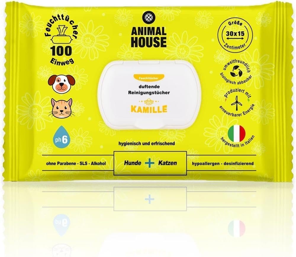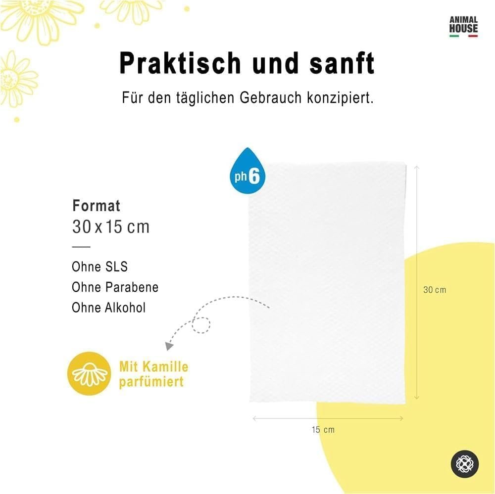 Animal House Kamillen Reinigungstücher 100er Packung Natürlich, feuchtigkeitsspendend und beruhigend, biologisch abbaubar und hypoallergen, für die tägliche Reinigung von Hunden und Katzen