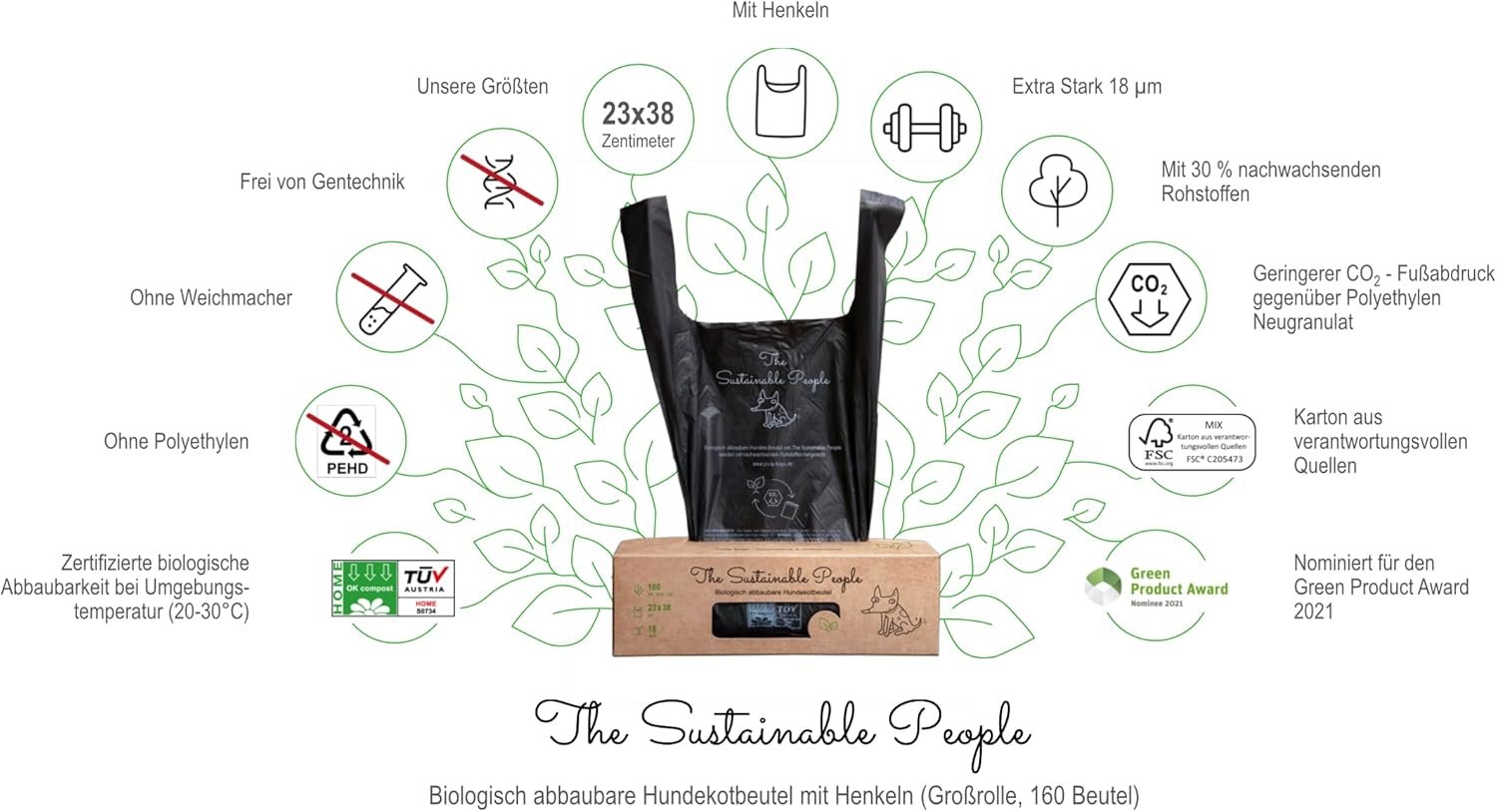 TSP Premium Bioabbaubare Hundekotbeutel mit Henkeln – OK compost HOME zertifiziert, 100% heimkompostierbar, Extra Dicke (18µm), Großrolle (160 Stück)