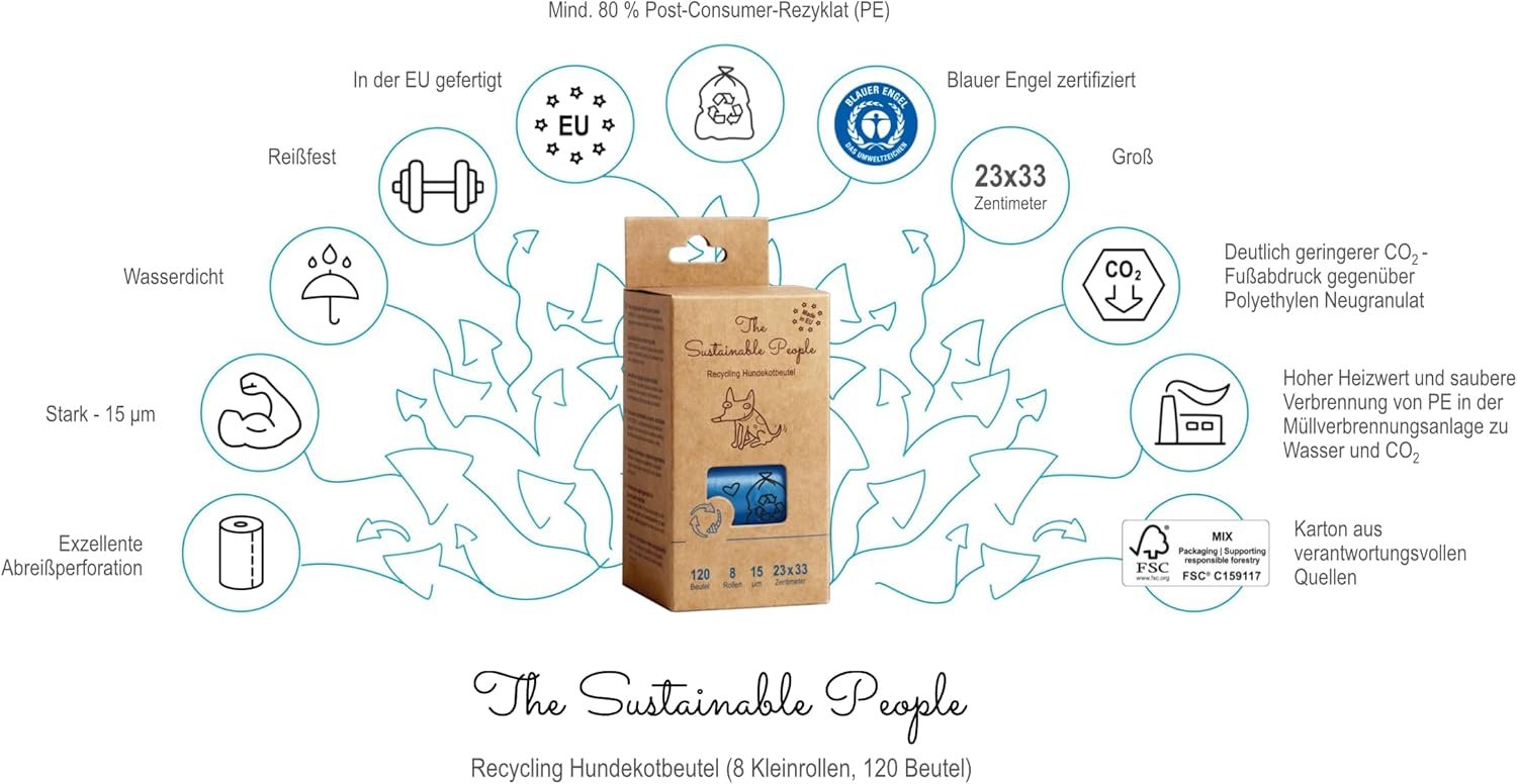 Die Sustainable People TSP Recycling Hundekotbeutel verbinden Umweltbewusstsein mit Alltagstauglichkeit. Hergestellt in der EU aus mindestens 80 % Post-Consumer-Rezyklat und Blauer Engel zertifiziert, bieten sie mit 23 × 33 cm großzügige Maße und 15 µm Stärke für auslaufsicheren Schutz. Die praktischen Rollen mit 120 Beuteln erleichtern die hygienische Entsorgung unterwegs sichern Sie sich jetzt diese nachhaltige und zuverlässige Lösung für jeden Spaziergang.